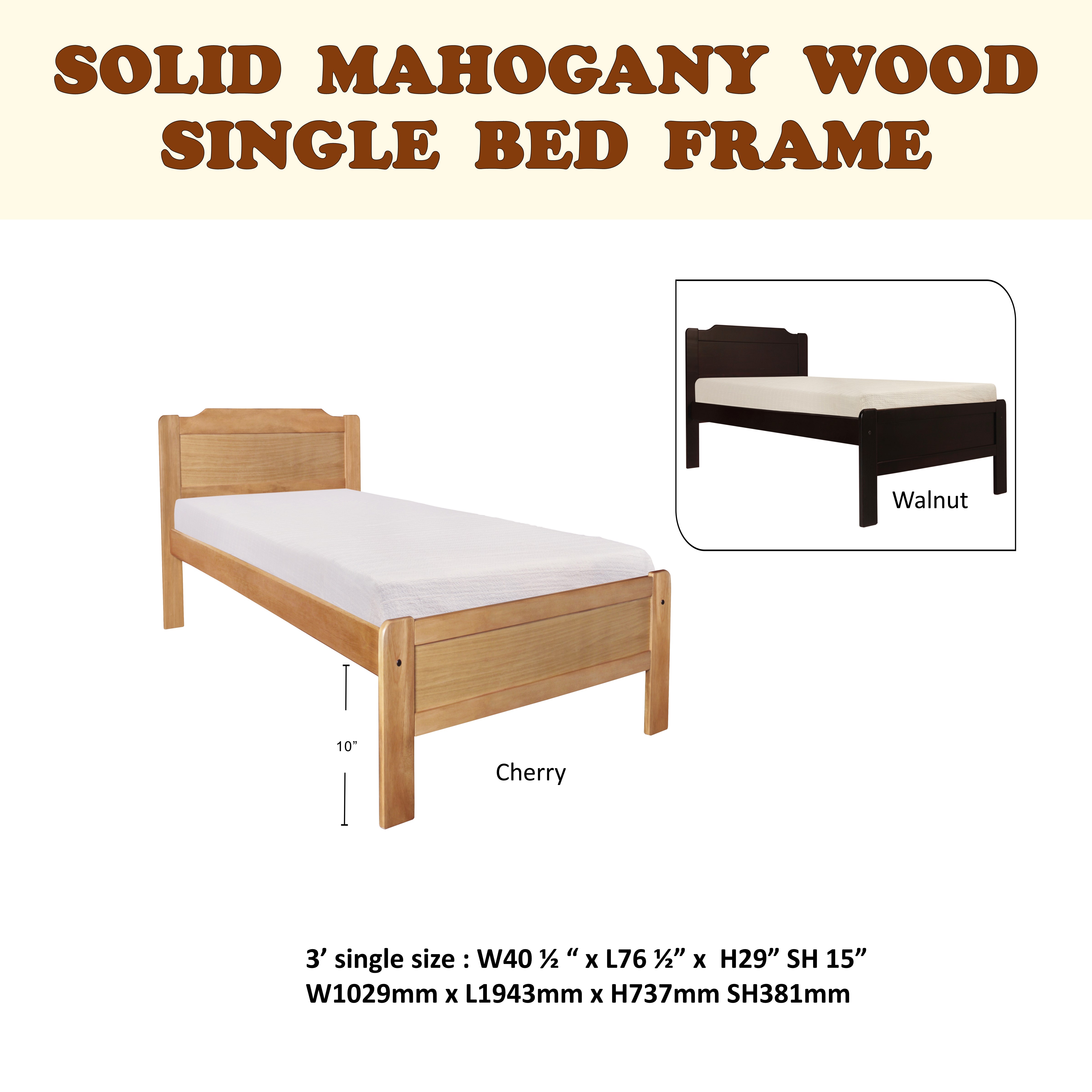 HENRY Mahogany Solid Wooden Single / Super Single Bed Frame In Cherry & Walnut Color