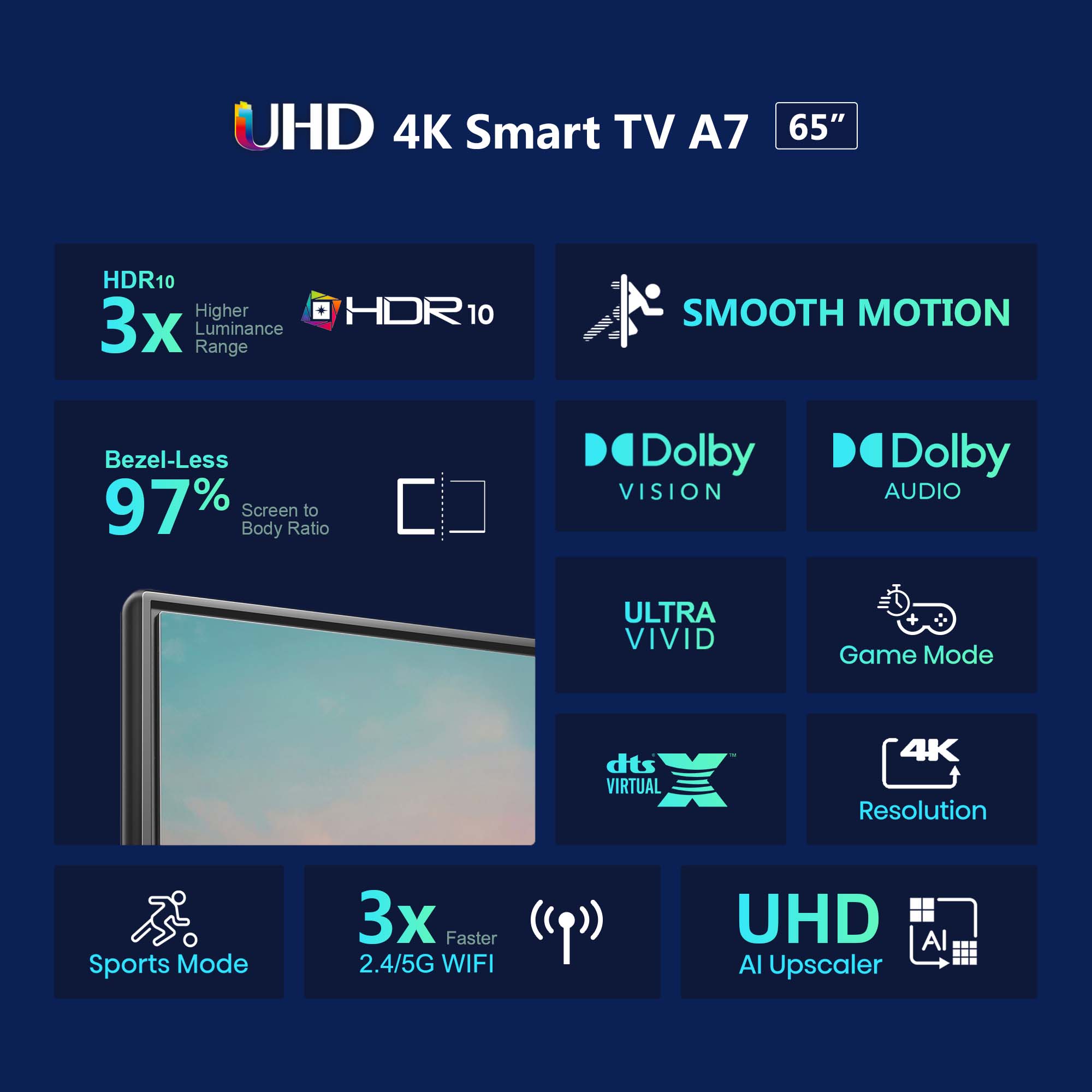 ?【Android TV】with Youtube, Netflix, Disney+ and 5000 more apps ?【Chromecast built in】Can cast your phone or other smart devices' screen to TV, ?【Dolby Vision & HDR 10】Enjoy dynamic and bright display quality ?【Dolby Audio & DTS Virtual X】Experience the most realistic 3D Surround ?【Google Assistant】Voice control your TV and smart home devices, a hands-free experience ?【4K Upscaling】4K AI Upscale: Best resolution arranged by intelligent software ?【Multi Modes】Sports and Game mode: Suitable for different requirements ?【Bluetooth remote】Longer distance 360° control compare to the traditional infrared controller ?【Wireless】Supports 2.4G and 5G dual wifi and Bluetooth 5.0 ?【Built-in ports】2 x HDMI, 2 x USB, Ethernet (Lan)