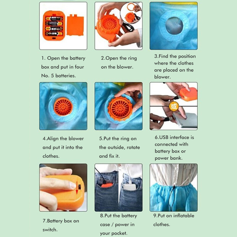 5.【Package】: 1 x Inflatable Garment, 1 x Inflatable Fan, 1 x Battery Case (battery not included). Inflatable garments are easy to inflate quickly. It's also a great gift.